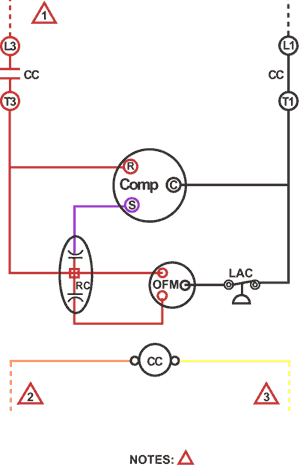 HVACR Electrical 113Module 6: Odds and ends of electrical drawingsPage 10 Animated Schematic: This schematic is of a simple A/C condensing unit. It is taken off from a RUDD schematic. The exercise is to mouse over the schematic following a circuit (circuit = power source, two conductors, a load and as many switches as you want). While you follow the circuit in the schematic form, the various junctions and connections are pointed out with images of the wires and components in the actual equipment. Let your instructor know if this is helpful to your understanding.